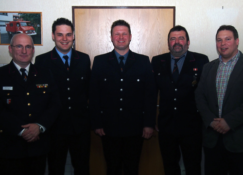 Die neue Führung der FFW Waldkatzenbach mit Abteilungskommandant Thomas Stelzer und Stellvertreter Sebastian Dietz mit Bürgermeister Markus Haas, Gesamtkommandant Michael Merkle und dem Manfred Thieme, der die Abteilung 14 Jahre lang führte und aus gesundheitlichen Gründen zurücktrat. (Foto: Hofherr)