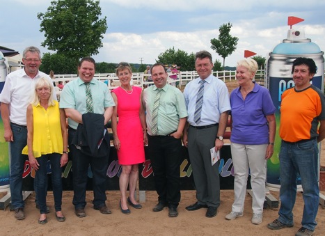 Die Ehrengäste um Schirmherr Landrat Dr. Achim Brötel (3.v.re.) feiern gemeinsam mit den Vertretern des RC Hoher Odenwald Waldbrunn und Bürgermeister Markus Haas (3.v.li.) die Ankunft des Neckar-Odenwald-Kreis-Cups auf dem Winterhauch. (Foto: Hofherr)