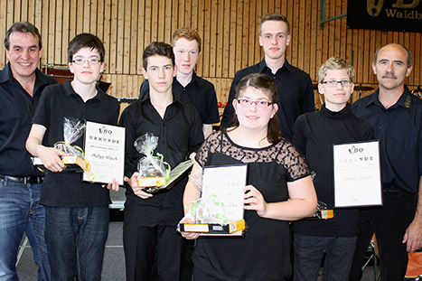 Für fünf Jahre aktive Mitgliedschaft wurden Bruno Böhme, Dennis Joksch, Philipp Wäsch und Katharina Weis geehrt. Zehn Jahre gehören Lucas Hehl und Dennis Schork dem JBO Waldbrunn an. Katharina Weis erhielt darüber hinaus das Jungmusikerleistungsabzeichen in Bronze. Nach dem Stück „Schlagzeilen“ ging es in die Pause.