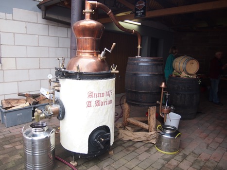 Eine seltene Gelegenheit bot sich am vorletzten Tag der Mostwochen. Im Gasthaus Engel in Mülben hatte Schnapsbrenner Eugen Schmitt seine Schaubrennerei aufgebaut und brannte original Odenwälder Schnäpse. Viele Interessierte waren gekommen um die Produktion von Hochprozentigem genauer unter die Lupe zu nehmen und sich den ein oder anderen „Kurzen“ zu genehmigen.