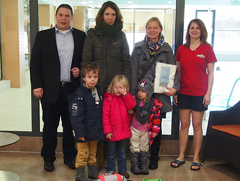 Das Bild zeigt Bürgermeister Markus Haas, Maria Stemmer, Tatjana Bader und Badleiterin Christine Friedrich (re.) mit den Kindern Frieda, Jona und Lina im Foyer der Katzenbuckel-Therme. (Foto: Hofherr)