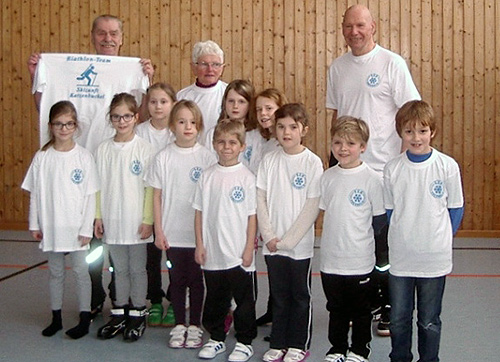 Die neu eingekleidete Kindergruppe der Skizungt mit Ihren Trainern und dem T-Shirts Logo: Biathlon Team der Skizunft Katzenbuckel gestiftet von der Familie Klinge. (Foto: privat)