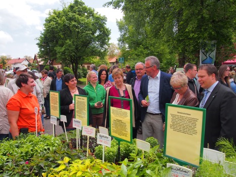 Karina Heilig (li.) von der Gärtnerei Heilig aus Waibstadt bereichert den Naturparkmarkt mit vielfältigen Topfkräutern. Manuela König (2.v.li.) erläutert den Ehrengästen die Idee hinter den Märkten. (Foto: Hofherr)