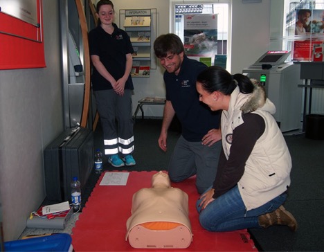 DRK-Bereitschaftsleiter Robin Bracht erklärt Sparkassenkundin Jessica Wörner die Wiederbelebungsmaßnahmen. Bevor man eingreift, sollte man aber auf jeden Fall den Rettungsdienst über die Telefonnummer 112 informieren. (Foto: Hofherr)