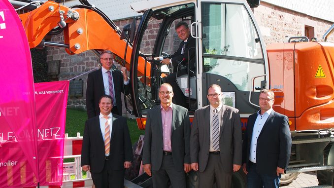 Mit Baggerfahrer Dr. Achim Brötel startete im Beisein von Bürgermeister Markus Haas (links vorn) und Dr. Norbert Rippberger (links hinten) gestern in Waldkatzenbach der vierte Bauabschnitt „Breitbandversorgung“. Bis Mitte 2017 soll in den Gemeinden Waldbrunn und Mudau für 95 Prozent der Bürger die Datenautobahn realisiert worden sein. Auch Telekom-Regionalmanager (Mitte), Projektkoordinator „Mister Breitband“ Johannes Biste (2.v.re.) von der WINO und Geschäftsführer Bernhard Kirschenlohr (re.) von der Baufirma Schuler-Bau Mosbach. (Foto: Hofherr)