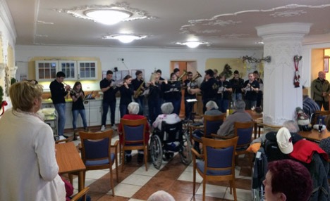 Waldkatzenbach. (pm) Am vierten Advent überraschte das JBO Waldbrunn unter der Leitung von Thomas Schäfer die Bewohner des DRK-Seniorenheims in Waldkatzenbach. Die Heimbewohner und deren Besucher wurden mit klassischen Weihnachtsliedern wie „Leise rieselt der Schnee“, „Es ist ein Ros entsprungen“ und vielen anderen erfreut. Die dargebotene Blasmusik berührte emotional und nicht nur „Stille Nacht, Heilige Nacht“ stimmte auf Weihnachten ein. Den einen oder anderen animierte sie auch zum Mitsingen.