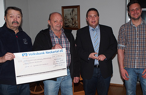 Unser Bild zeigt von links: Egon Haas und Heinz Stephan vom ehemaligen Bürgerverein Waldbrunn überreichen die Spende in Höhe von 638 Euro an Bürgermeister Markus Haas und Patrick Bier von der Jugendfeuerwehr. (Foto: Hofherr)