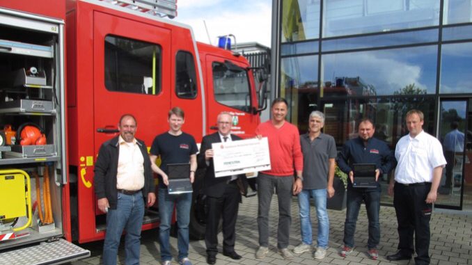Nachdem die Schollbrunner Firma Fenestra Fensterbau GmbH vertreten durch die Geschäftsführer Ralf Pietsch und Eckard Schölch die Feuerwehren der Gemeinde Waldbrunn bereits im vergangenen Jahr mit einer großzügigen Spende unterstützten, und so die Anschaffung von zwei „Mobilen Tablets“ ermöglichten, luden die Unternehmer die Helfer der Freiwilligen Feuerwehren (FFW) dieser Tage zur offiziellen Spendenübergabe. Mit den mobilen Geräten im Wert von 500 Euro können die beiden Löschfahrzeuge der Feuerwehr Waldbrunn ausgestattet werden. Die Tablet-Computer ermöglichen den Einsatzkräften am Einsatzort aber auch schon auf der Anfahrt zu den Einsatzstellen auf Feuerwehr-Einsatzpläne und Hydrantenpläne in digitaler Form zuzugreifen. Darüber hinaus sind die Geräte mit einer Datenbank für PKW-Rettungskarten und einer Gefahrgut-Datenbank ausgestattet, die Einsatzkräfte bei einem Unfall schnell mit wertvollen und wichtigen Einsatzinformationen versorgen können. Im Einsatzfall werde vor Ort wertvolle Zeit gespart, wusste der stellvertretende Gesamtkommandant Björn Erb zu berichten. Die Geräte werden aber auch zu Schulungszwecken und für den Feuerwehr-Unterricht genutzt. Bürgermeister-Stellvertreter Heinz-Dieter Ihrig dankte den beiden Geschäftsführern für die großzügige Spende, mit der die ohnehin knappe Gemeindekasse entlastet werde. Den Dankesworten schloss sich auch der stellvertretende Gesamtkommandant Björn Erb an.