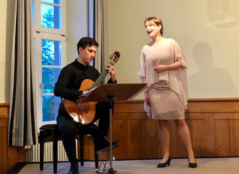 Die beiden jungen Künstler begannen ihr facettenreiches Programm mit „Five Songs“ des englischen Renaissance-Komponisten John Downland in einer Bearbeitung für Gitarre und Gesang von Michael Ernst. In einer kurzen Hinführung zur Musik ließ Julia Spies die Zuhörer zunächst wissen, dass früher viel Musik für Lauten geschrieben worden sei, deren Part nun die Gitarre übernimmt. Außerdem bat sie darum, nicht den ausliegenden Text oder dessen Übersetzung zu lesen, sondern sich von der „manisch-depressiven Stimmung“ der „Five Songs“ mitreißen zu lassen.
