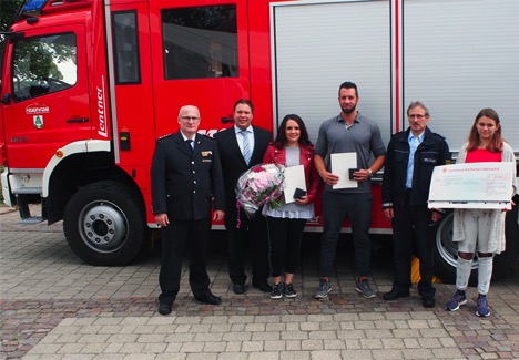 Unser Bild zeigt von links: Gesamtkommandant Michael Merkle (FFW Waldbrunn), Bürgermeister Markus Haas, die Lebensretter Luisa Ihrig und Marcel Heiß, Harry Huß (Polizeiposten Limbach) und Angelina Schmitt mit dem Spendenscheck in Höhe von 1.000 Euro. (Foto: Hofherr)